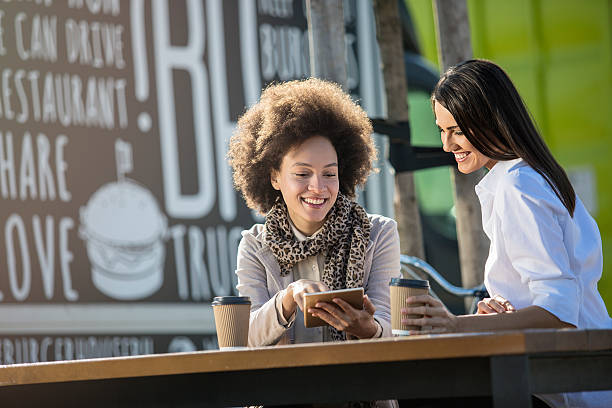 pretty women talinkg while drinking coffee - junk food stock pictures, royalty-free photos & images