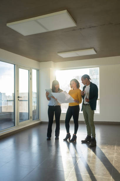 rear view of young woman looking out picture window - home decoration stock-fotos und bilder