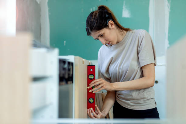 a man putting wallpaper on wall - home decoration stock pictures, royalty-free photos & images