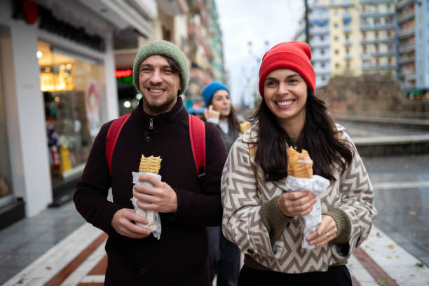 two friends eating pizza on the street - junk food stock pictures, royalty-free photos & images