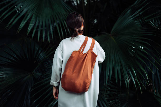 rear view of young asian woman relaxing in a park. she is carrying a brown reusable bag against green nature plants. responsible shopping, zero waste and sustainable lifestyle concept - fashion stock pictures, royalty-free ph