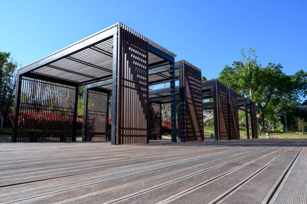 old tree with flower pots - garden decoration stock pictures, royalty-free photos & images