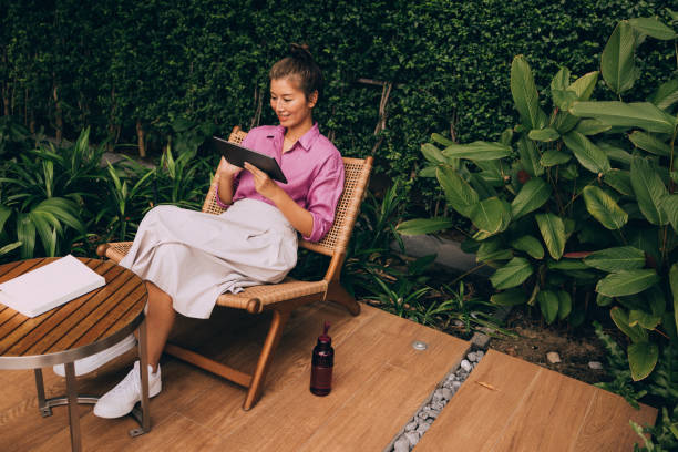 hanging chair in the backyard - garden decoration photos et images de collection