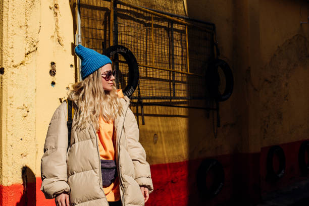 portrait of senior woman standing outdoors in town. - fashion stock-fotos und bilder