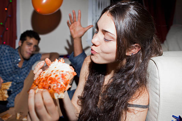 happy young woman eating pizza on car hood - junk food stock pictures, royalty-free photos & images